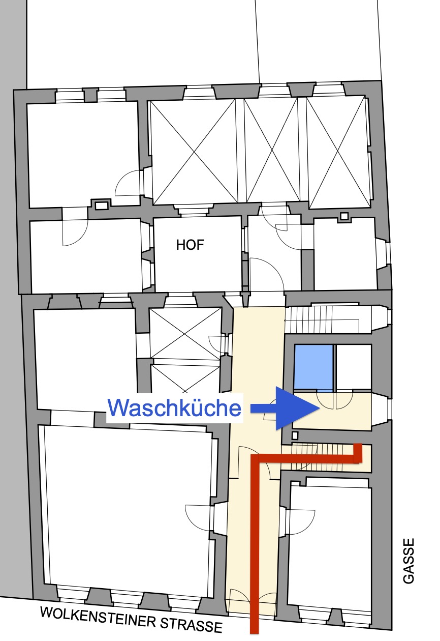Lage der Wohnung und der Waschküche (Waschmaschine, Trockner, Bügelbrett und Bügeleisen):