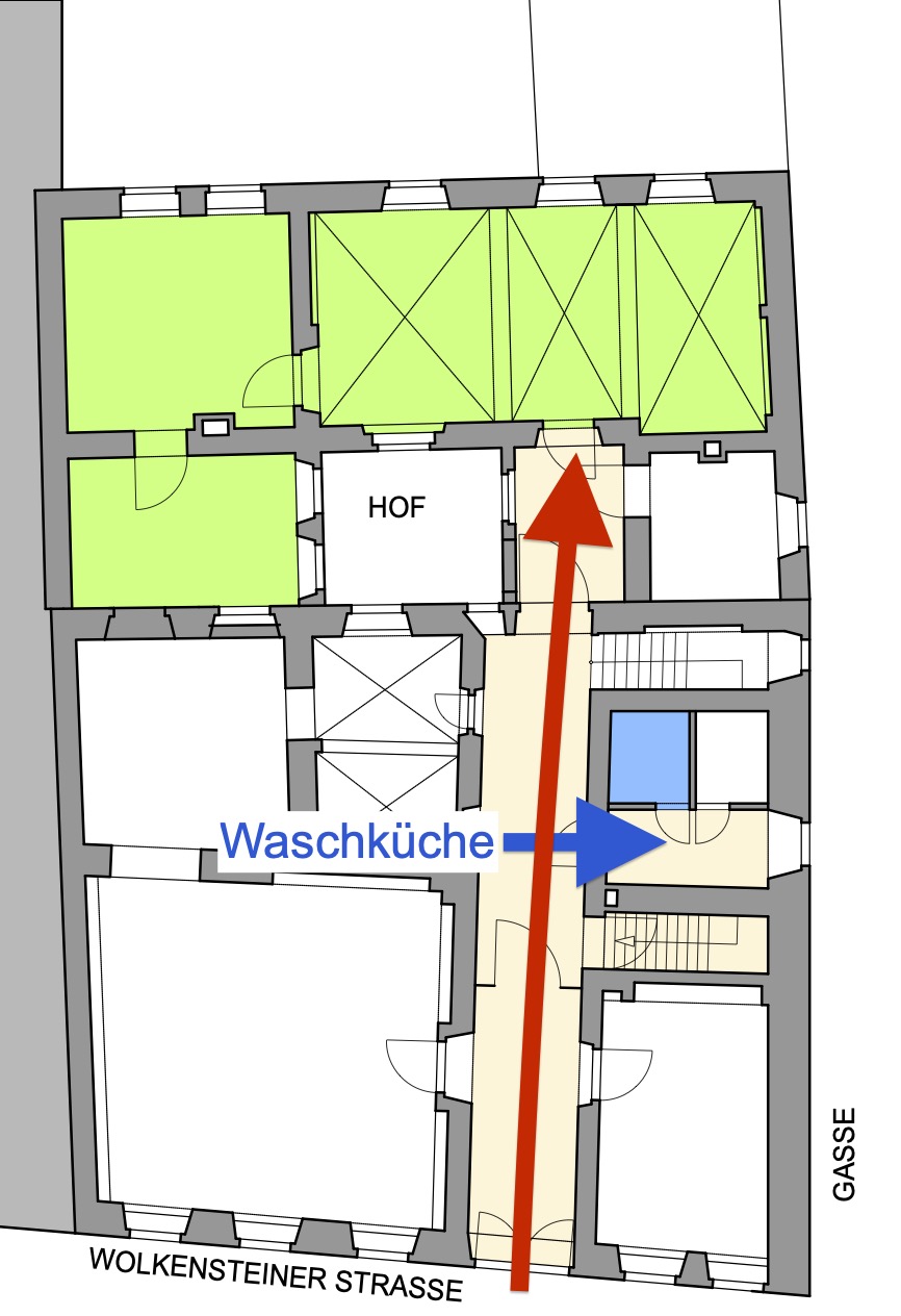Lage der Wohnung und der Waschküche (Waschmaschine, Trockner, Bügelbrett und Bügeleisen):